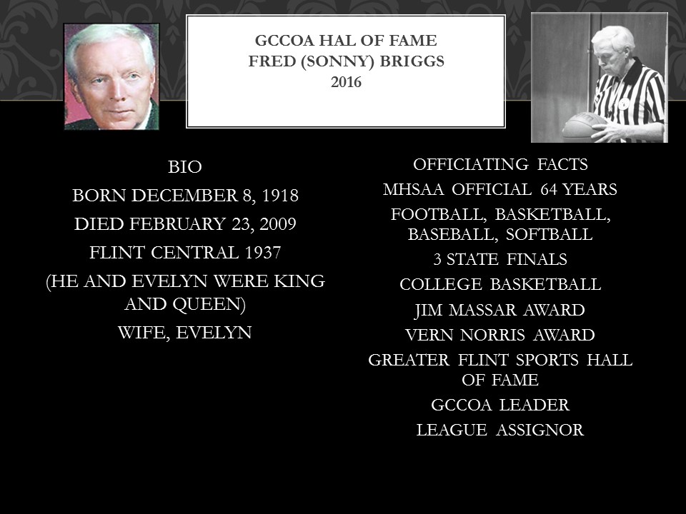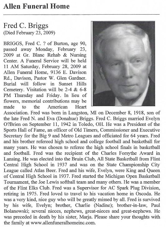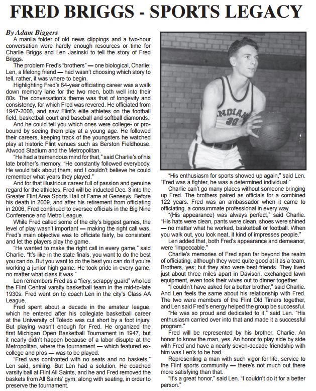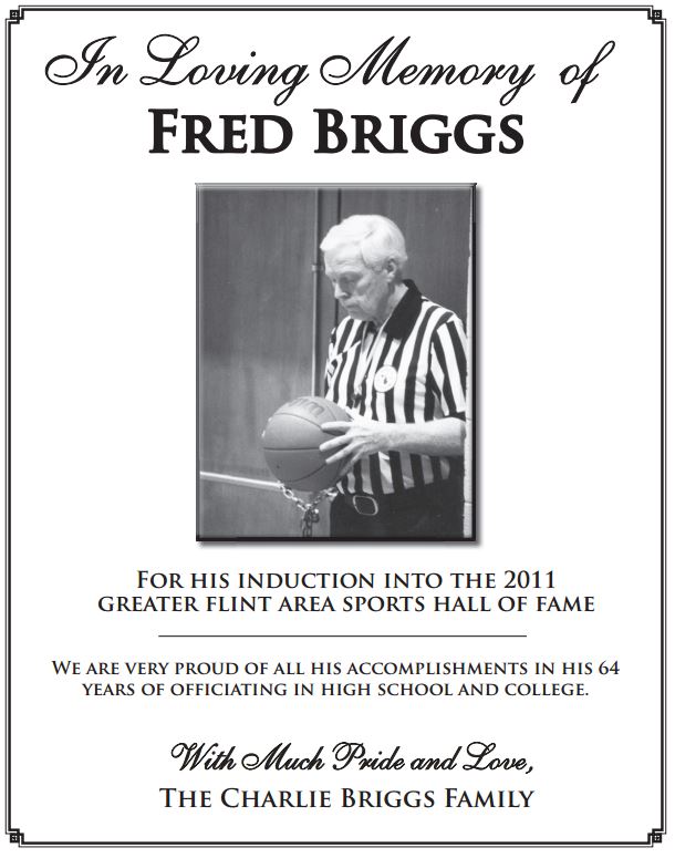 When you speak of officiating, in Genesee County and the State of Michigan, it is inevitable that Fred and Charley Briggs names will be mentioned. They were the consummate referees. I had the honor of playing, coaching and hiring them during my life. It was always a pleasure and relief when they would walk onto the football field, basketball court or a baseball/softball diamond.