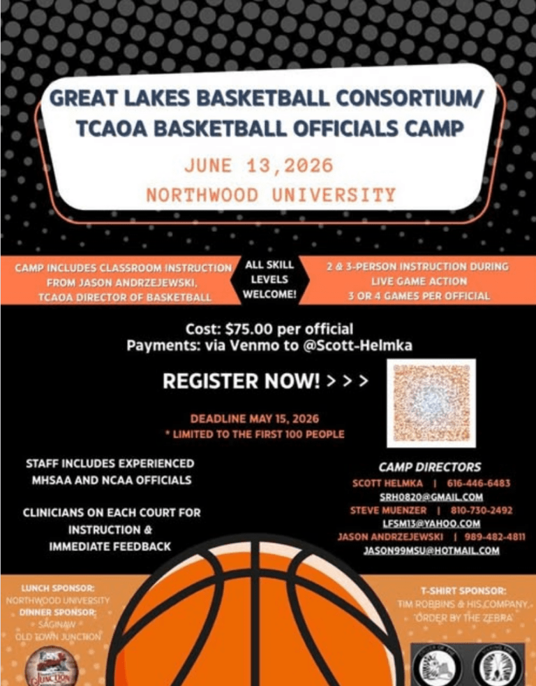 Feb 24, 2026: Basketball Camp, Saturday June 13, 2026 at Northwood University. Hosted by Steve Muenzer, Scott Helmka, & Jason Andrzejewski. Cost is $75 which includes Camp T-Shirt, Lunch and Dinner. Limited to the first 100 registrants. Registration is open immediately https://forms.gle/DHabfqUn3UubViDK7